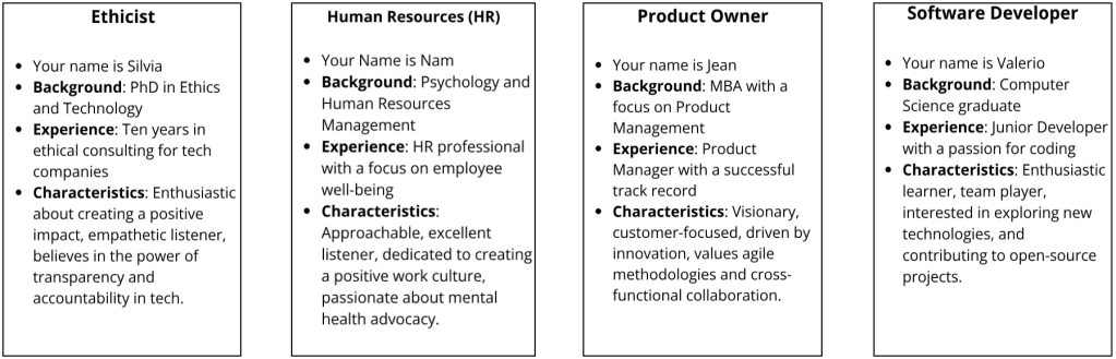 Division in groups and discussions between participants with the same roles (following the 1-2-4-all method) to facilitate the following step (discuss in groups with one person for each role)