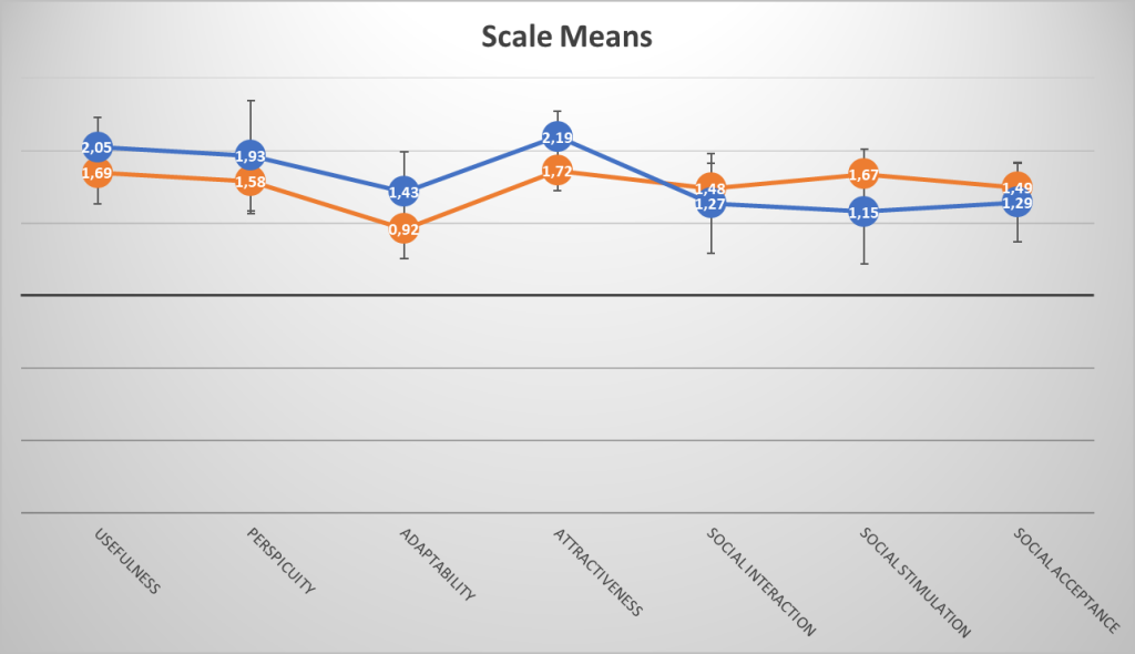 - UEQ+[3]: A customizable UX set of items designed to build a questionnaire tailored to the specific research objectives. We specifically measured dimensions such as usefulness, perspicuity, adaptability, attractiveness, social interaction, social stimulation, and social acceptance.